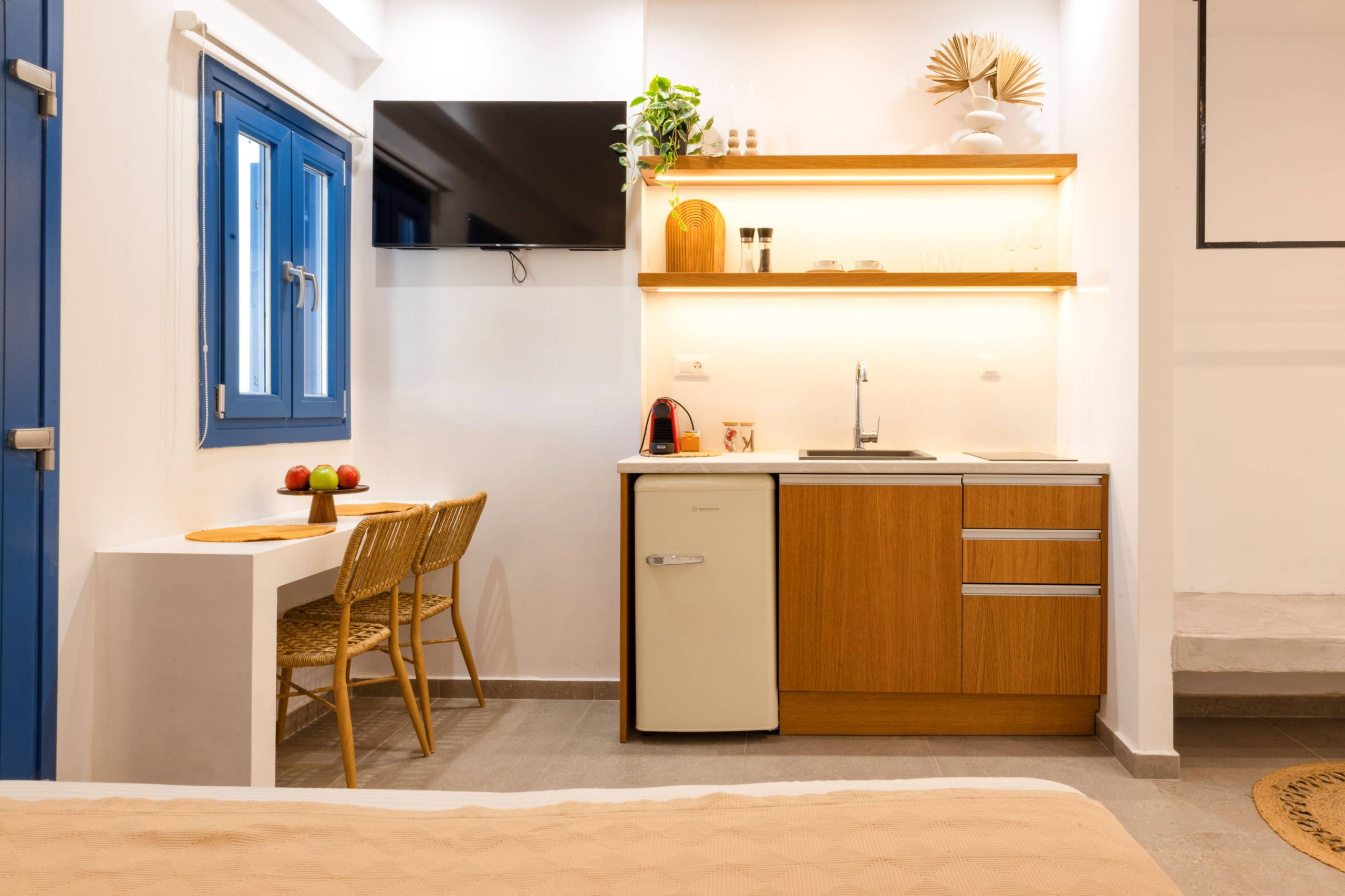 Μοντέρνο και κομψό δωμάτιο με minimal αισθητική και γήινους τόνους, ιδανικό για ζευγάρια που αναζητούν άνεση και χαλάρωση. Υπάρχει δυνατοτητα επιλογής κρεβατιού διπλό ή δύο μονά, με ποιοτικά λευκά είδη και προσεγμένες λεπτομέρειες που δημιουργούν μια ζεστή και φιλόξενη ατμόσφαιρα.Το δωμάτιο περιλαμβάνει πλήρως εξοπλισμένη μικρή κουζίνα με ψυγείο, εστία, καφετιέρα και βασικά σκεύη, καθώς και τραπεζάκι για δύο άτομα.