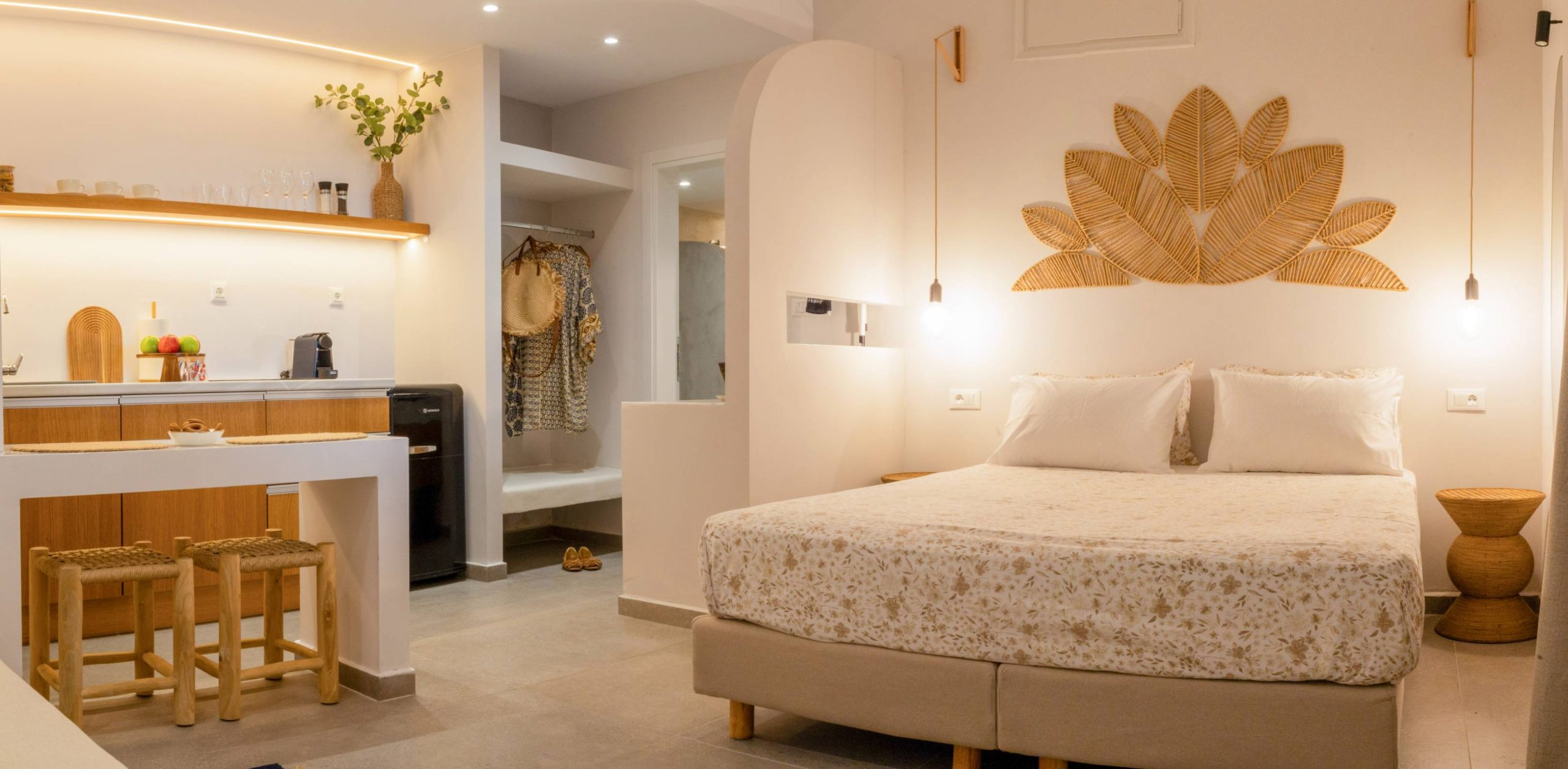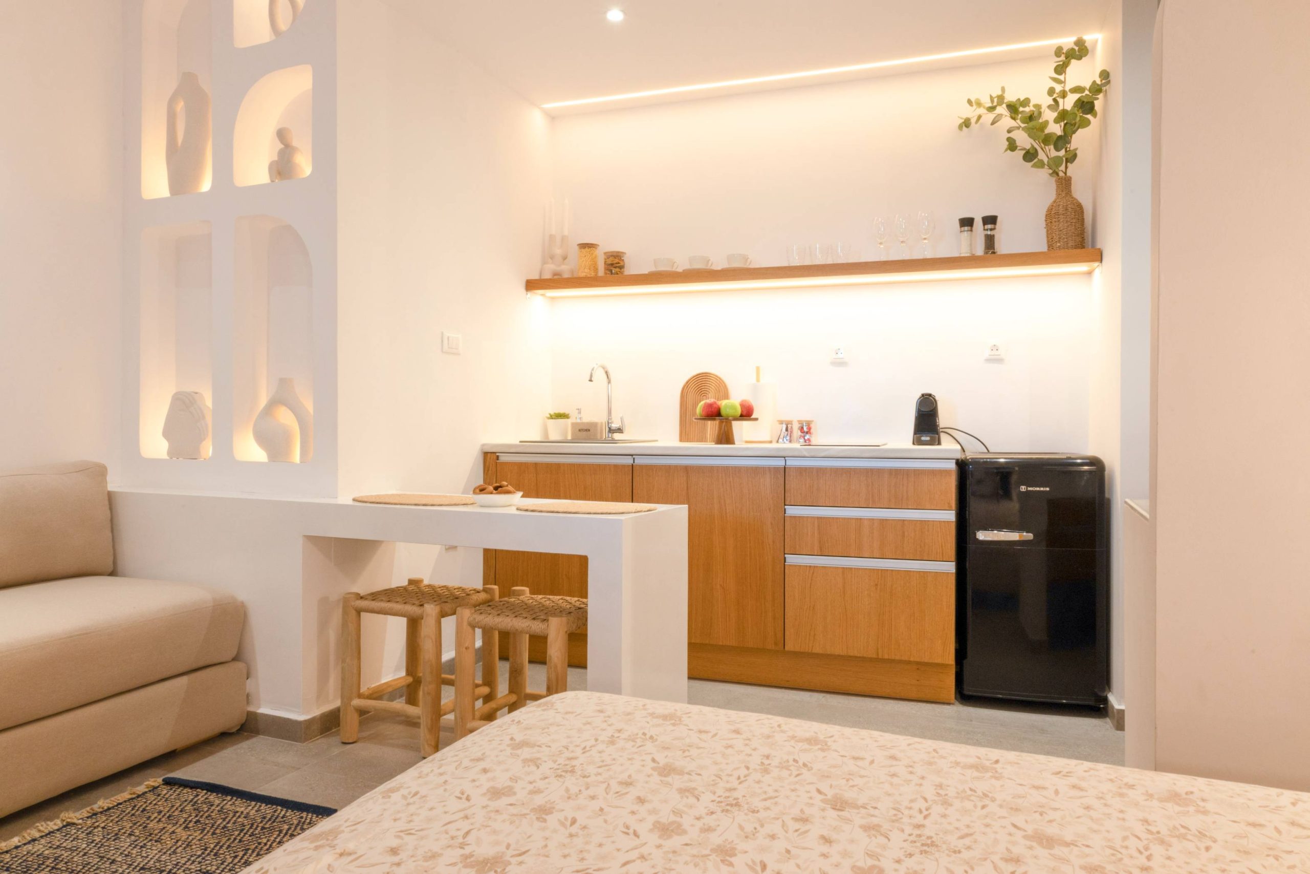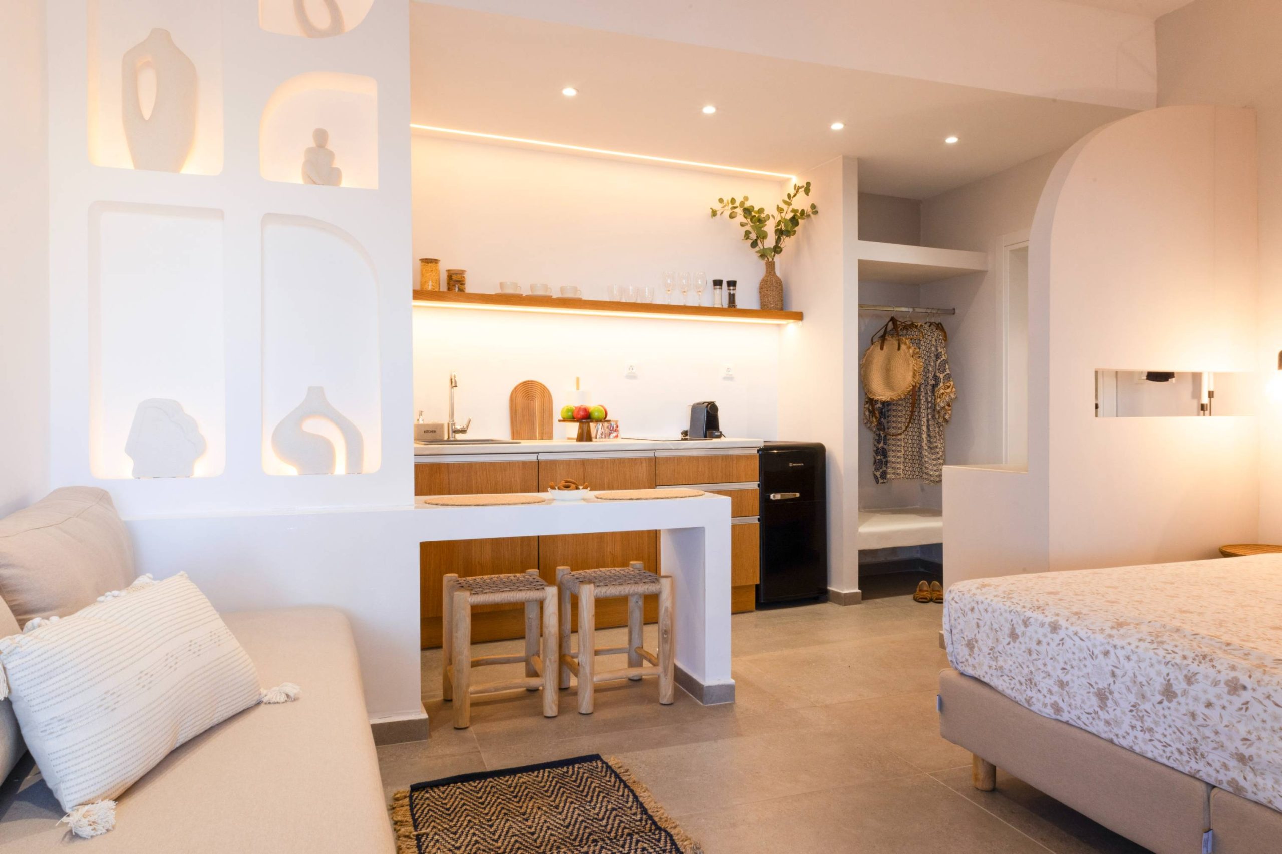 Ένα κομψό, πλήρως ανακαινισμένο studio που συνδυάζει τη σύγχρονη αισθητική με τις παραδοσιακές νησιώτικες γραμμές. Οι απαλές γήινες αποχρώσεις, ο ζεστός κρυφός φωτισμός και οι αρχιτεκτονικές καμπύλες δημιουργούν μια ατμόσφαιρα χαλάρωσης και διακριτικής πολυτέλειας.